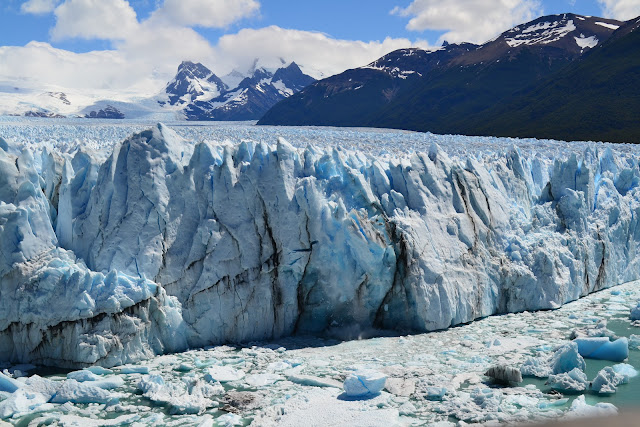 Los 30 km de largo Glaciar Perito Moreno, desemboca en el Lago Argentino y tiene una superficie de aproximadamente 250 kilómetros cuadrados. Por día, el hielo se mueve hacia adelante cerca de tres pies.